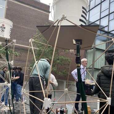 Our project team designed and built a gravity-driven water tower that balanced structural stability with fluid performance. The goal was to optimize the tower height and nozzle diameter to maximize both endurance and jet power in a head-to-head competition, where teams used their water streams to push a block along a track. The truss-based tower, featuring 3D-printed joints and cross-bracing, minimized buckling while supporting a raised reservoir that discharged through an optimized 7.62 mm nozzle. Using Python models based on pump data and Torricelli’s law, we predicted the system’s fill and discharge behavior. The final design achieved a flow rate of 0.149 L/s, maintained structural stability under load, and advanced to the semifinal round of the competition.